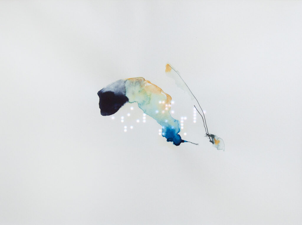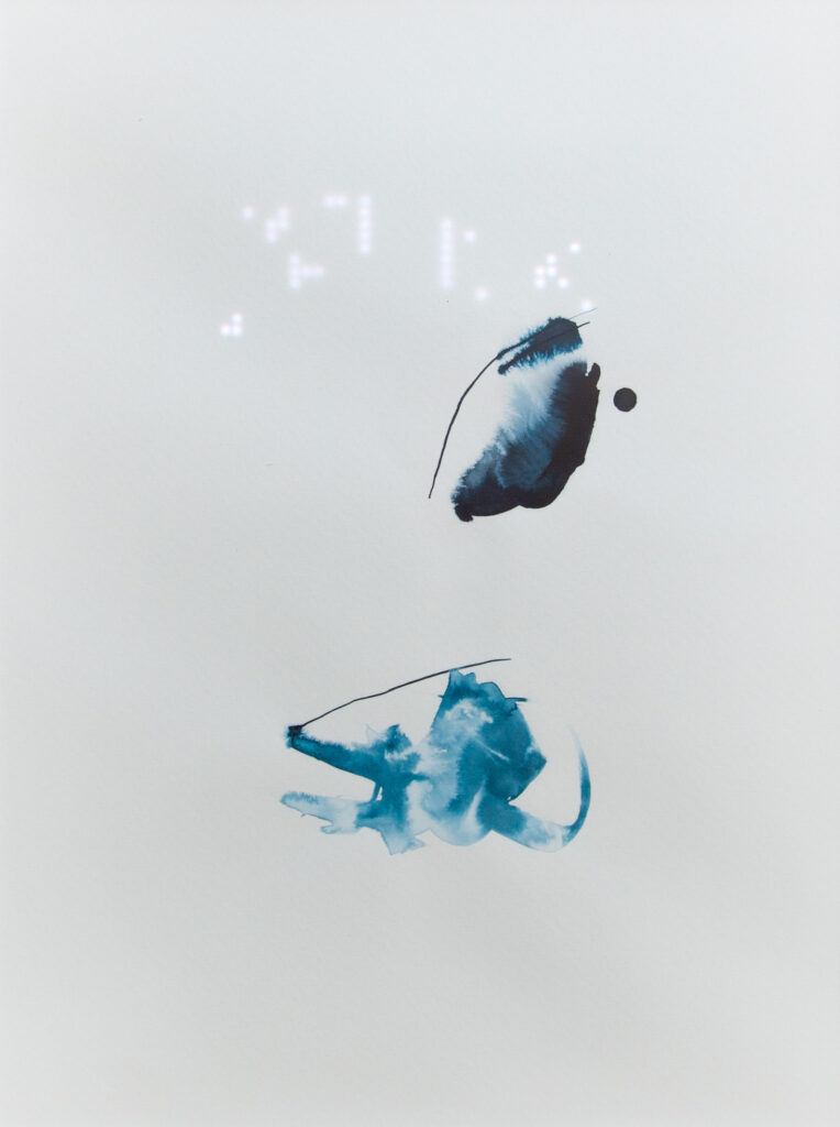 Im Werk der Künstlerin taucht wiederkehrend die Frage nach einer der Natur immanenten Medialität auf, die unabhängig vom technologischen Fortschritt funktioniert. Die Arbeit À la lumière zeigt Schatten menschlicher Figuren, die mit einem Projektor auf Gesteinsfragmente projiziert werden. Diese Fragmente stellen sich bei genauerem Hinsehen als Fossilien heraus, die aus versteinerten Ammoniten bestehen. Die menschlichen Schattenfiguren sind das Produkt einer technologischen Medialität. Und auch die Fossilien sind, anders als man glauben mag, keine Ammoniten mehr, sondern nur ihr in Stein übertragener Abdruck. Dieser natürliche Prozess der Bildgenese ähnelt jenem der Fotografie.